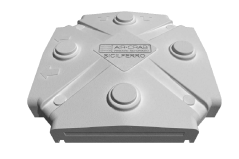 La cupola AirCrab è l’ elemento modulare in EPS che costituisce il vespaio iso-areato AirCrab.Ogni elemento misura in pianta 50×50 cm ed ha un’ altezza di 10 cm.La forma di calotta convessa, modellata con nervature di irrigidimento diagonali, viene poggiata sui quattro supporti di appoggio (UpCrab).Grazie al suo sviluppo con incastri maschio-femmina consente una rapida messa in opera con i piedini UpCrab.