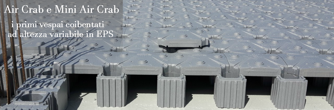 UpCrab sono gli elementi piedi da 5,10,15,20,25 e 30 cm, in EPS, ad altezza variabile con un passo multiplo di 5 cm, assemblabili tra di loro a seconda delle esigenze progettuali.UpCrab consentono di isolare le pareti laterali dei pilastrini che si vengono a formare nel punto di unione delle gambe degli elementi cupola. L’accostamento degli elementi AirCrab e UpCrab costituisce il cassero per il successivo getto di calcestruzzo, che assume la caratteristica forma a volta.