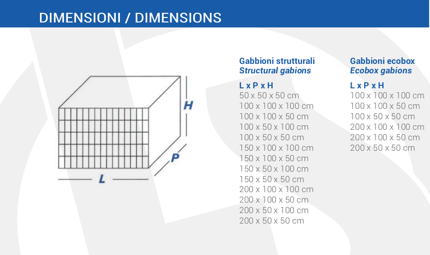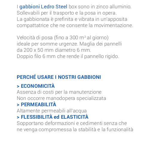 Produce in proprio gabbioni in rete metallica diffusamente utilizzati nella realizzazione di muri di sostegno di sottoscarpa e di controripa in ambito di consolidamento di versante, ferroviario, stradale, idraulico ed arichitettonico.
